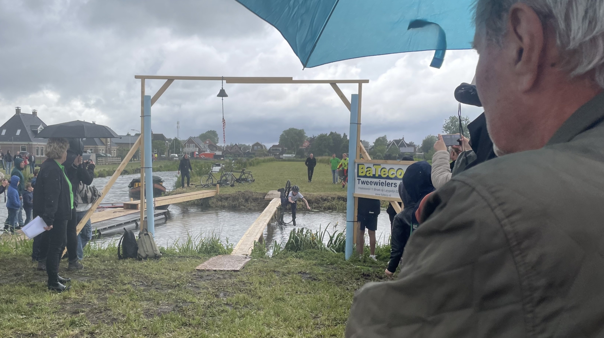 Om aan het verwachtingspatroon te voldoen stuurt één van de deelnemers zijn fiets het water in. Een flinke plons volgt. "Moet je hem nou zien gaan!" roept een toeschouwer lachend. Maar het is natuurlijk het leukst als het écht mis gaat. Iemand verliest zijn evenwicht en dondert vol in de sloot. "Oooo daar gaat-ie dan! De eerste echte!", wordt geroepen. De reddingsbrigade vist de beteuterde deelnemer uit het water. (tekst gaat door onder de foto)