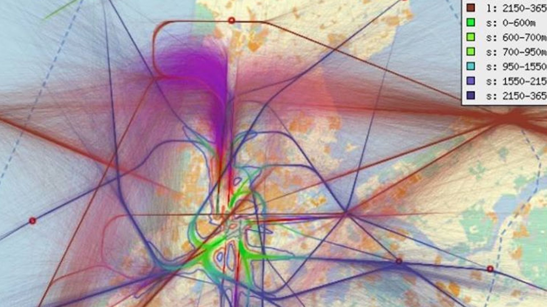De paarse lijntjes zijn de huidige routes van de vliegtuigen die in een maand tijd richting de Polderbaan vliegen.De zorgen zijn opnieuw opgelaaid door plannen voor een vaste toenaderingsroute en een wijziging van de nachtelijke vertrekroute vanaf de Polderbaan. Als het aan de nieuwe voorstellen ligt, zullen nachtelijke starts ter hoogte van Limmen een bocht naar het westen maken, met mogelijk 557 nachtvluchten per jaar over het dorp en omliggende wijken. Hans: “Dat betekent meer lawaai, meer hinder en vooral: meer slaapverstoring. Terwijl het nu al nauwelijks te doen is.”