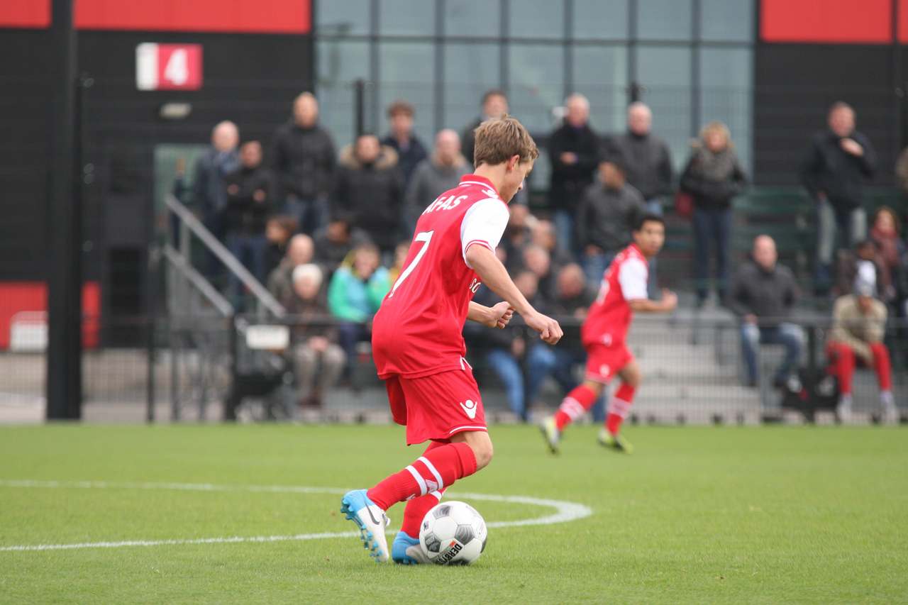 Alkmaar, 14 oktober 2012. Zaterdagmiddag was bij AZ voor de tweede keer een Non League day te beleven. Waar de eerste NLD een succes was qua bezoekersaantallen, was het sportief een tegenvaller want er moest een nederlaag genoteerd worden. Dat ging zaterdag aanmerkelijk beter! AZ Onder 15 wist namelijk Vitesse/AGOVV C1 te verslaan met een mooie en verdiende 2-1 overwinning. De AZ supporters gingen er ook vol voor en organiseerden een heus vuurwerk waardoor de sfeer er goed inzat en de jonge spelers zich serieus aangespoord voelden. En dat vertaalde zich al binnen twee minuten in de eerste treffer toen Teun Koopmeiners die met een mooi schot het net van de bezoekers wist te vinden. De tweede treffer kwamop naam van Ferdy Druijf waarna Vitesse/AGOVV nog meteen aandrong en AZ een tegentreffer moest incasseren. De tweede helft liet zien dat het spel van AZ zich op een net wat hoger niveau bevond, maar dat vertaalde zich niet meer in een extra treffer. Het optreden van doelman Sven Verswijveren is zeker het vermelden waard: hij toonde zich uitermate bekwaam en zelfverzekerd. Sportfotograaf Peter Heins maakte het spektakel mee en maakte deze reportage..