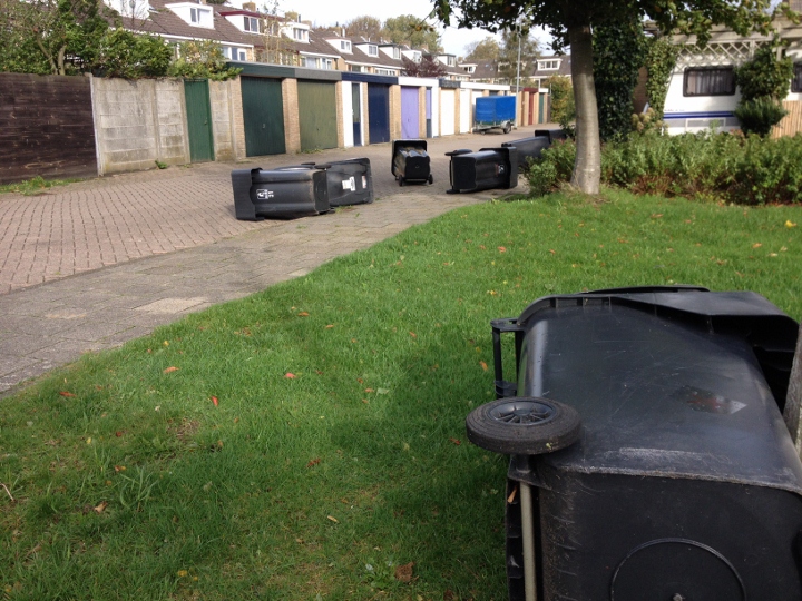 Alkmaar, 28 oktober 2013. Maandag is een stormachtige dag die zijn sporen nalaat in Nederland en dus ook in Alkmaar. Foto's van de gevolgen komen gestaag binnen. Op industrieterrein Huiswaard bij de Kwakelkade/ Koedijkerstraat fotografeerde Jim van der Sluis een boom liggend een aantal auto's. Deze zijn vermoedelijk van De Autohandel (foto 1). In de Prunuslaan is een boom vol op straat gevallen en deze is vastgelegd door Andre Wagensveld (foto 2). Dankzij 'Thaibox Tanja' is te zien dat er in de Lekstraat geen schade is, maar dat het wel lijkt alsof er bowling XL is gespeeld met de vuilnisbakken. Voor zover bekend zijn er geen gewonden gevallen. Wat ook opvalt is dat veel mensen straks de ramen moeten lappen vawnege de ziltige spray met fijn zand, die vanaf de kust het land in waait.