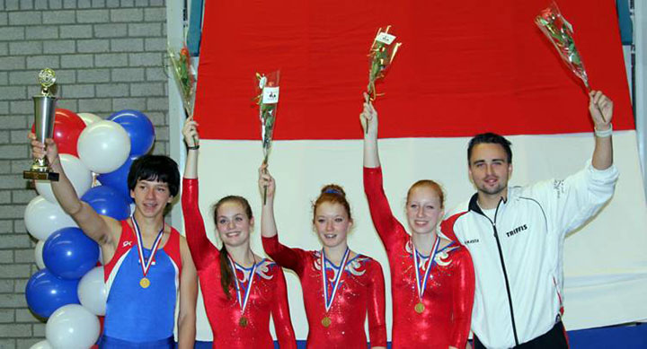 Alkmaar, 16 december. Zaterdag heeft het A-team van trampolinevereniging Triffis haar favorietenrol waargemaakt. Na eerdere overwinningen tijdens de plaatsingswedstrijden en de internationale Golden River Team Cup, werd gisteren het succesvolle jaar afgesloten met het kampioenschap van Nederland. In het A-team van coach Sven Mooij kwamen Roel Teillers, Pascal Wiebering, Niamh Slattery en Bo Bet in actie.