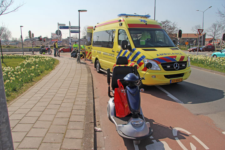 Alkmaar, 29 maart 2011. Vanmiddag is op de kruising Nieuwe Schermerweg/Rijnstraat een 76-jarige vrouw uit Alkmaar gewond geraakt bij een eenzijdig ongeval met haar scootmobiel. Toen ze met één wiel tegen een vluchtheuvel reed raakte de scootmobiel uit balans en viel de vrouw er af. Ze raakte daarbij met haar hoofd nogal hard het wegdek waardoor ze een forse bult op haar hoofd opliep. Maar omdat ze bloedverdunners gebruikt is ze voor onderzoek overgebracht naar het Medisch Centrum Alkmaar. Het ongeluk werd gemeld door en automobiliste die het zag gebeuren, de motorambulance was als eerste ter plaatse.