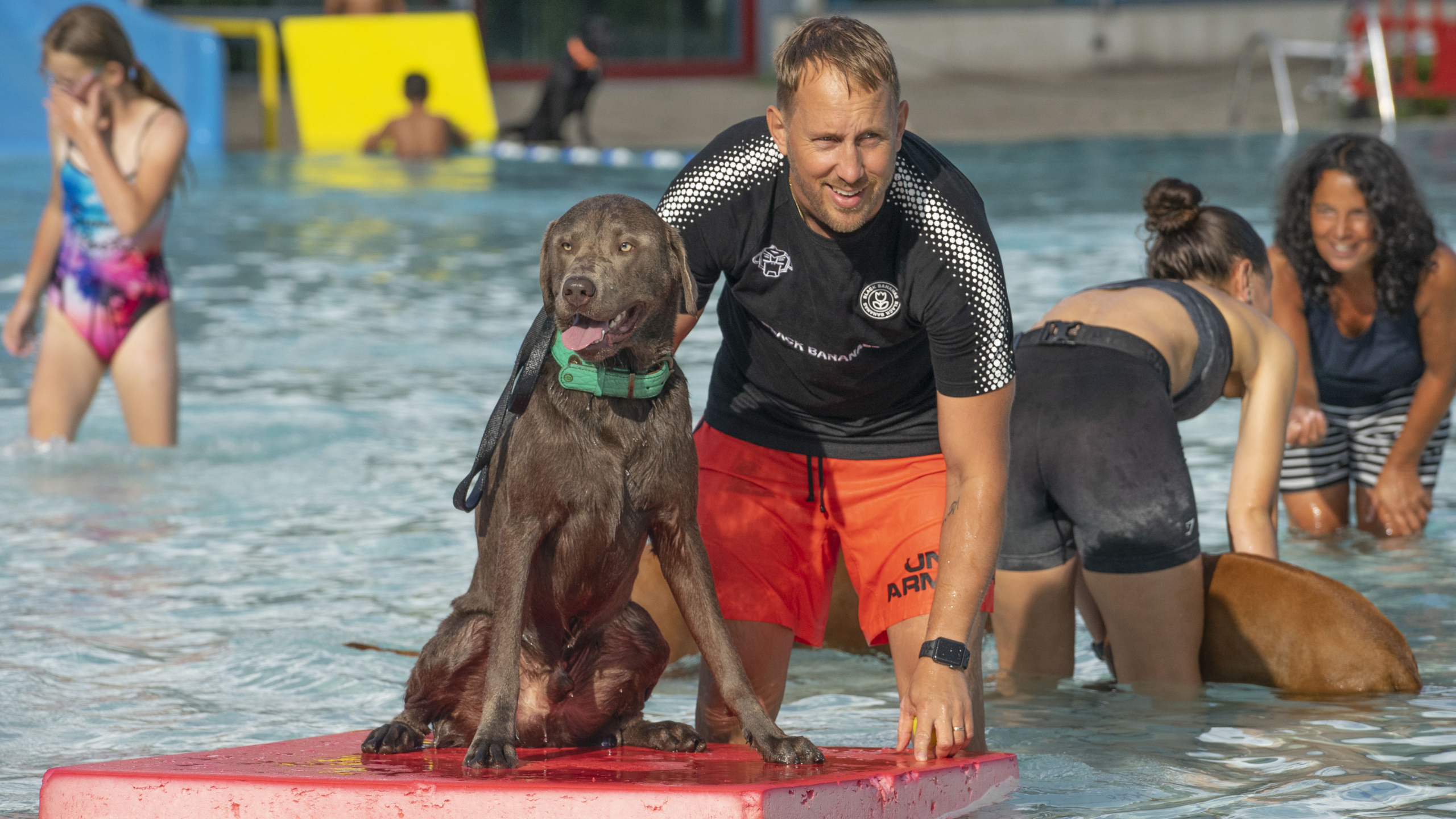 Traditioneel is het buitenseizoen bij zwembad Hoornse Vaart afgesloten met een 'hondenplons'. Tientallen baasjes kwamen zondag met hun hond naar het Alkmaarse zwembad om zich een middag te leven in en om het water, en op de vlotten die in het water lagen. Op een paar honden die echt geen zin hadden na, vermaakte iedereen zich uitstekend.