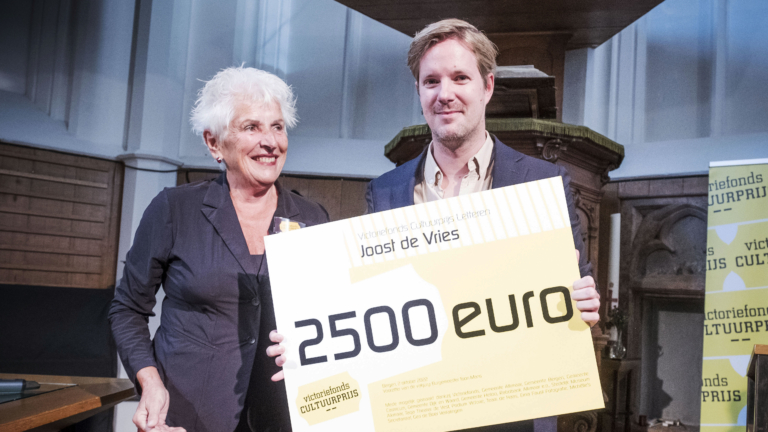 Joost de Vries heeft dit jaar de Victoriefonds Cultuurprijs Letteren gewonnen. Zondag kreeg hij de tweejaarlijkse prijs in handen tijdens een feestelijke bijeenkomst in de Ruïnekerk van Bergen, die werd geleid door de bekende schrijver Ronald Giphart.
