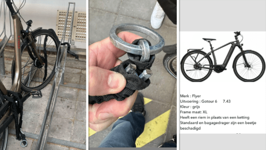 Het schijnt steeds vaker te gebeuren dat elektrische fietsen verdwijnen uit beveiligde stallingen bij stations. Maandag is er eentje uit de stalling van Station Heerhugowaard gestolen. En deze Flyer Gotour6 van 4.000 euro stond niet alleen op slot, maar ook met twee dikke kettingsloten vast aan een rek en een andere e-bike. De kettingen waren keurig doorgeslepen. Via Facebook wordt een oproep gedaan om uit te kijken naar de fiets, en er wordt met verontwaardiging op gereageerd.