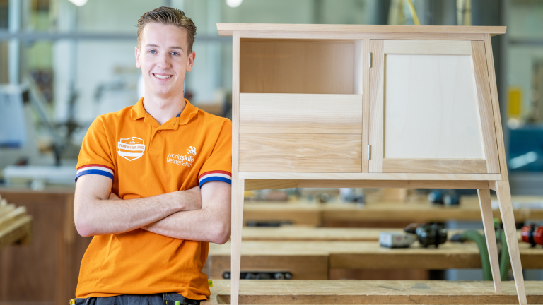 In maart werd Jort al Nederlands Kampioen Meubelmaken voor mbo'ers. En toen de Limmer hoorde dat hij ook nog eens in september naar het WK mocht was hij "ontzettend blij. Maar ik wist ook dat ik het enorm druk zou gaan krijgen de komende tijd." Want om deel te mogen nemen, moet je minimaal 280 uur trainen. (tekst loopt verder onder foto)