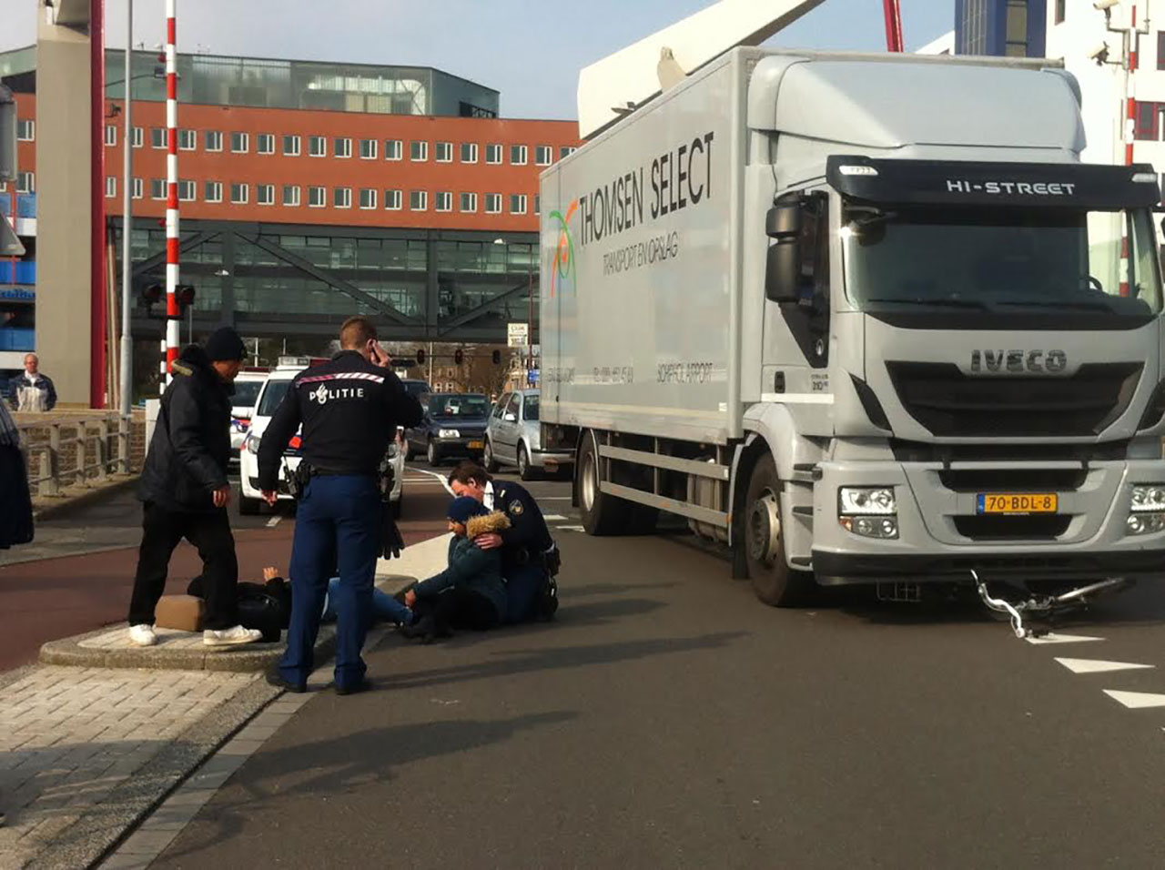 Alkmaar, 27 maart 2014. Alkmaar, 27 maart 2014. Donderdagochtend raakten twee fietsers gewond nadat ze bij de Tesselsebrug tussen het verkeer door en pal voor een vrachtwagen de weg overstaken. Toen de vrachtwagen weer in beweging kwam raakten ze er met hun fiets onder bekneld. De chauffeur reageerde razendsnel toen hij gegil hoorde en trapte meteen op de rem. Daarmee heeft hij waarschijnlijk het leven van de fietsers gered. Beide vrouwen zijn naar het ziekenhuis vervoerd, één met nekklachten, de ander met pijn aan de schouder. De hevig geschrokken chauffeur is door de politie opgevangen. Foto's: DNP.NU