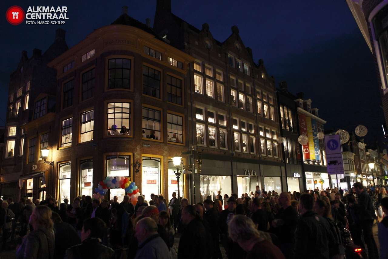 Alkmaar, 28 september. Zaterdagavond was het weer zo ver: Gratis parkeren in de Schelphoekgarage, overal muziek, DJ's in de winkels en straten, en winkelen to 23.00 uur. Afgaand op de hoeveelheid mensen die de weg naar de Laat en (vooral) de Langestraat wisten te vinden was Shoppingnight 2014  een succes. Zoals ieder jaar is de start van de Shoppingnight ook het moment waarop de sfeerverlichting in de binnen stad voor het eerst onstoken wordt en die eer viel wethouders Viktor Kloos en Elly Konijn te beurt. Via een grote rode knop werd de verlichting ingeschakeld. Alkmaar Centraal fotograaf Marco Schilpp wilde niets missen van deze jaarlijkse 'shopping-frenzie' en maakte dit fotoverslag.